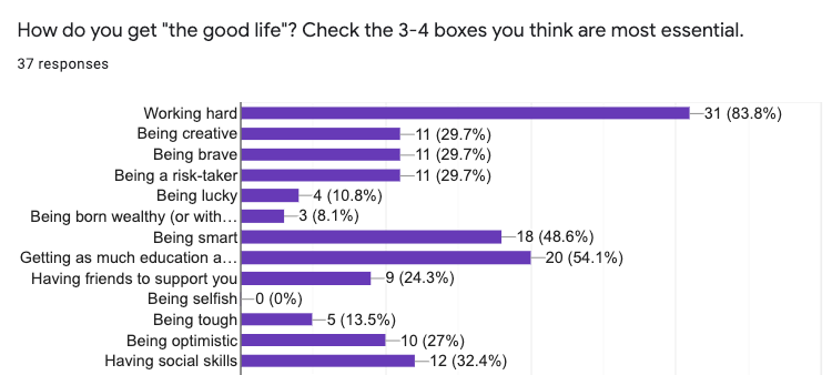At the start of my Of Mice and Men unit, I poll my students, the young cogs-to-be, about their definition of “the good life,” hoping to have them see parallels between their concept and that of George and Lennie, Depression-era strivers. They have to pick four “ingredients” from a long list (like “marriage,” “a home you own,” “an expensive car,” “free time,” “a six-figure salary,” and so on) and also identify several behaviors (like “working hard”), actions (like “finishing college”), and circumstances (like “inherited wealth”) likely to benefit them. I also have them administer the same survey to grown-ups in their homes. The results are fascinating: in segregated Marin County, at a school made up of 65% Latino students, these mostly concentrated in one dense neighborhood on the edge of town, lawyers, therapists, marketing executives, house-cleaners, carpenters, and landscapers weigh in — a portrait of the community. They prize ownership, health, careers, good deeds, and money. They have faith in effort and determination, like the kids in my classes, and they’re similarly cautiously optimistic about one’s chances for success, although they focus more on needs than wants. The 14-year-olds are much more likely to fixate on lucrative employment and luxury than the grown-ups, who, when pressed, gravitate towards self-sufficiency and responsibility. Health feels more important to 50-year-olds. Teens think about friendships more than marriage and kids, travel and cars more than stability and peace.